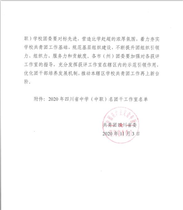 在全校师生共同努力下,由校团委牵头组建的兰台名团干工作室入选“2020年四川省中学(中职)名团干工作室”。