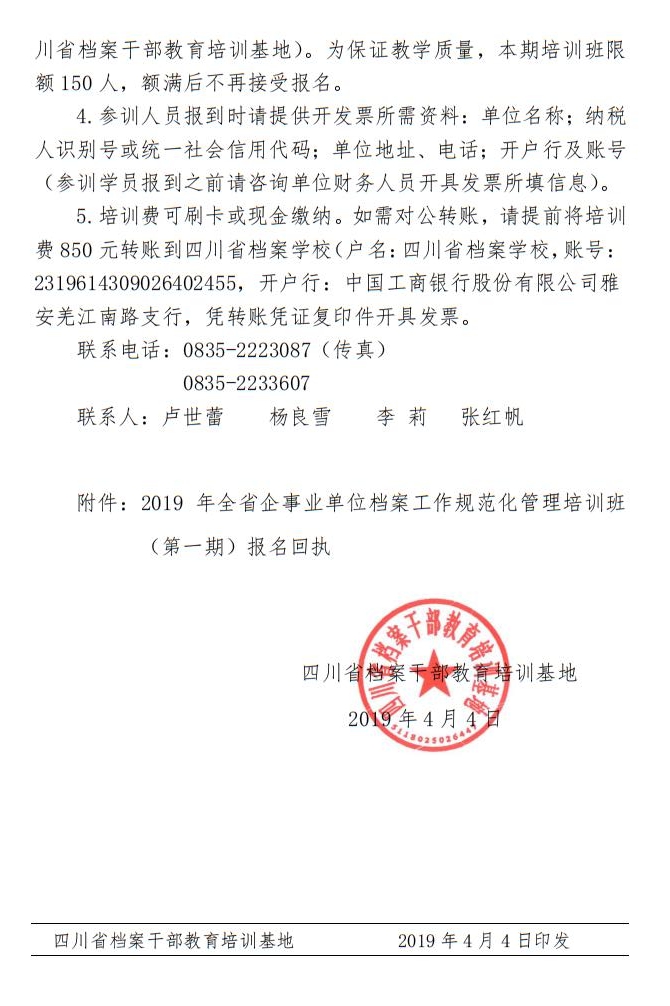 四川省档案干部教育培训基地关于举办2019年全省企事业单位档案工作规范化管理培训班(第一期)的通知