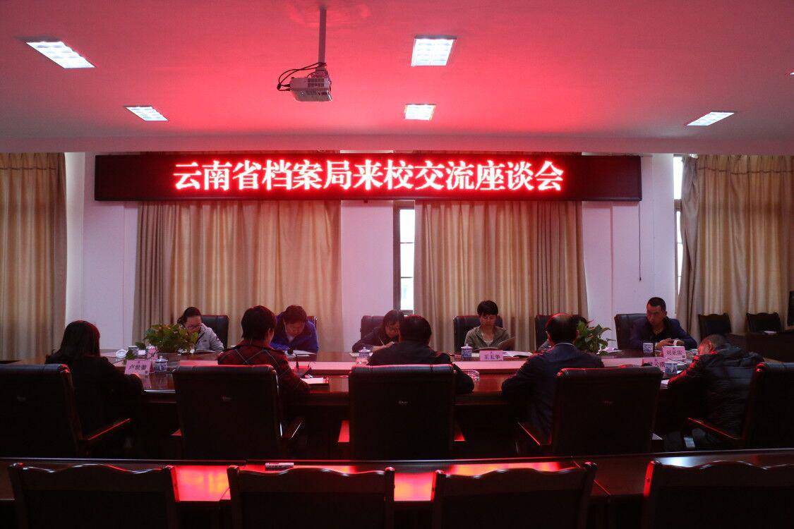 在调研座谈会上,童以鸿代表学校对李颖一行的到来致以热烈的欢迎,并向来访人员介绍了我校的发展历程、学历教育、干部培训、校企合作机制、档案数字化手段、省级示范学校创建等方面的工作。随后,伍琼从档案保护利用的角度,重点介绍了四川省档案局保护技术处在档案修复方面的情况,期望今后与云南省档案局加强沟通交流,推进双方档案工作的进一步发展。听取介绍后,李颖对我校在档案工作方面取得的成绩表示赞许,指出学校近年来发展快、变化大,校园呈现新面貌,是学校师生努力的结果,是全国兰台界的骄傲。尤其是学校的科研成果丰硕,校企合作深入,办学特色鲜明,档案管理流程完善,今后将积极引进我校档案专业毕业学生到云南省档案局实习就业。