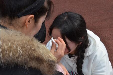 妈妈为女儿拭去眼角的泪水