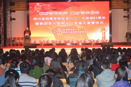 2016年12月9日下午,我校在学校大礼堂举行了纪念“一二•九”运动81周年暨新团员入团和十八岁成人宣誓仪式。共青团雅安市委副书记陆艳,四川省档案学校党委副书记、副校长张其可等相关教师出席活动。共有来自全校的1000余名学生代表参加此次活动。