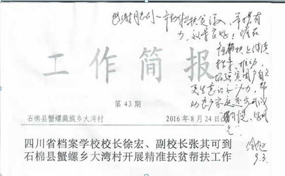 近日,四川省档案学校党委书记、校长徐宏,党委副书记、副校长张其可在石棉县蟹螺藏族乡大湾村一组贫困户家中开展联村帮扶活动。雅安市副市长徐旭专门对此次联村帮扶工作简报进行了签批,内容是:“感谢同志们辛勤付出、扶贫深入,举措有力,效果良好!请在产业帮扶上继续指导、推动,增强贫困户自力更生意识和动力,帮助农户家庭逐步形成好习惯、好风气。”