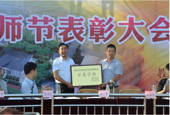 熊福建代表雅安市民宗局向学校授“雅安市民族团结示范学校”牌匾。