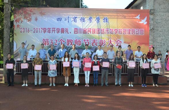 9月9日上午,四川省档案学校隆重举行2016-2017学年开学典礼暨四川省民族团结示范学校创建启动和32个教师节表彰大会。四川省档案局副局长周书生,雅安市教育局副局长王瑞华,雅安市民宗局副局长熊福建等领导出席会议。