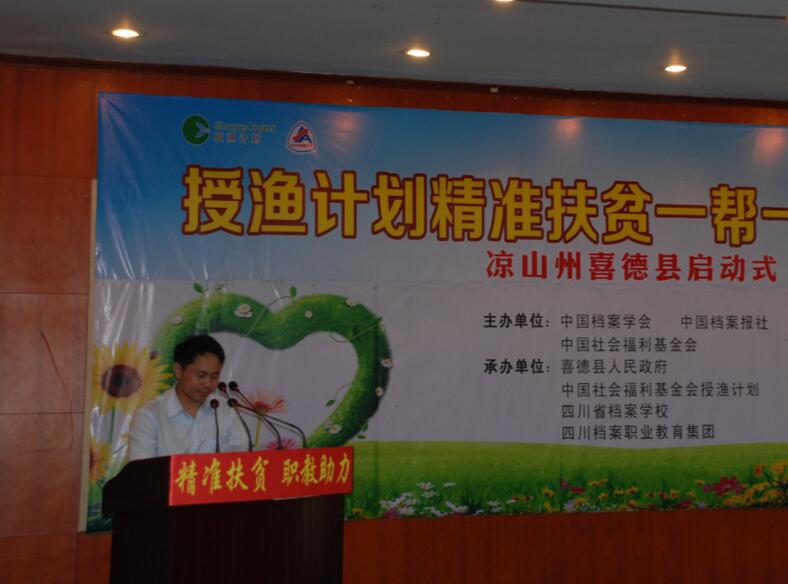 启动式由中国档案学会、中国档案报社、中国社会福利基金会主办,喜德县人民政府、中国社会福利基金会授渔计划、四川省档案学校、四川档案职业教育集团承办。旨在通过中国社会福利基金会“授渔计划”,帮助300名喜德县的贫困学生到四川省档案学校就读,2年时间内,为每人提供6000元生活资助,帮助其完成中等职业教育和后续的成人大专教育,掌握一门专业技能,实现高质量就业,从而达到阻止贫困代际传递的目的。