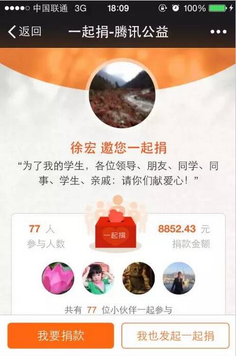 徐宏校长通过腾讯公益一起捐发动身边同事朋友为程朝萍同学捐款