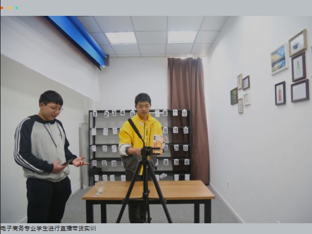 “大家可以看到这个杯子的造型非常简洁大方,玻璃很有质感,至于价格呢,今天超级优惠!”电子商务专业学生杨俊杰正在做直播带货的实训,对着镜头十分熟练地介绍产品。他是本场直播的主播,旁边还有同学担任副播,正在操作手机进行产品上架等辅助工作,而他们前方围着十几位同学观摩,不时地给出“肢体动作很自然”“刚介绍时卡了一下壳”等评语。