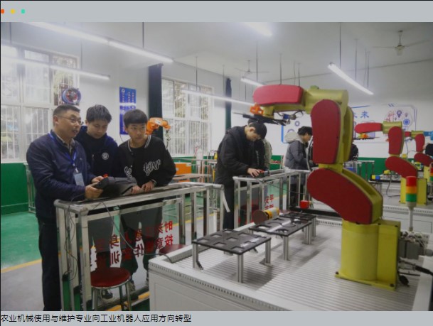 走进工业机器人的实训室,学生们分成三个小组,正在对焊接、码垛、维修机器人进行操作。2019年,农业机械使用与维护专业筹备转型工作,与深圳天杰集团达成战略合作协议,学校投入场地和师资,企业投入资金和设备,在2020年招收了第一届订单班学生。教学负责人罗祯胜介绍,每学期,企业都会和学校老师共同调整、优化课程内容,还会为学生带来工业机器人文化、行业及就业的主题讲座,他说道:“老师认真教、学生认真学、企业认真带,课堂成果也在慢慢凸显。”