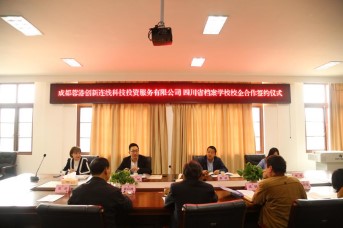 成都蓉港创新连线科技投资服务有限公司培训部总经理都浩、企划总监霍海铃、总经理助理柴琦、档案校副校长童以鸿和相关科室负责人参加签约仪式。