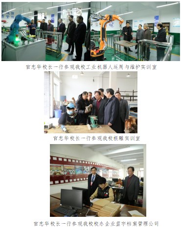 官忠华校长一行先后参观了我校工业机器人运用与维护专业实训室、校办企业蓝宇档案管理公司、根雕实训室、继续教育大楼等校内实训场地,并对我校鲜明的办学特色、办学模式和优美古朴的校园环境给予了高度评价。