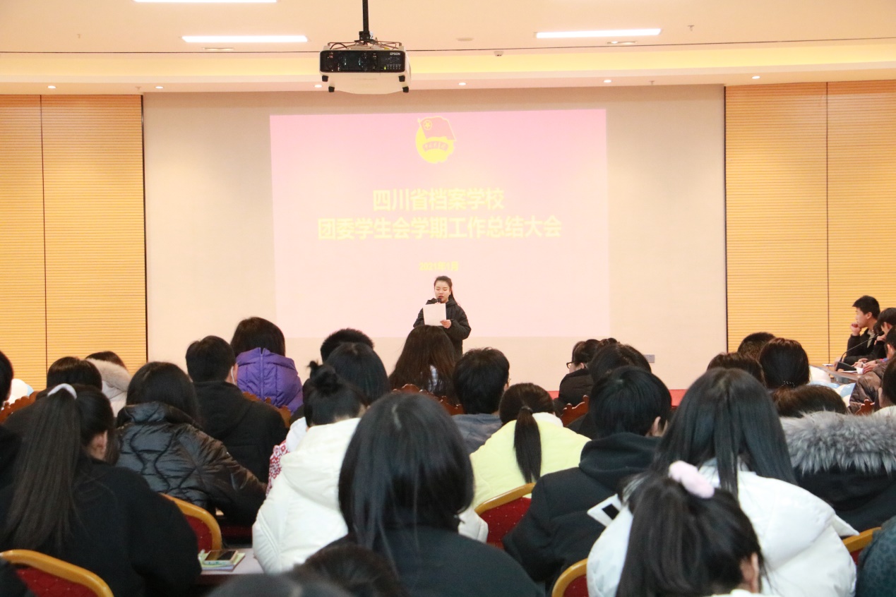1月11日下午,四川省档案学校校团委学生会学期工作总结大会暨第二十四届学生骨干聘任仪式在继续教育大楼二楼大会议室召开。学生科副科长罗莉出席会议并讲话,各部门指导老师及学生干部共320余人参加会议。会议由校团委秘书处秘书长杨雅萍主持。