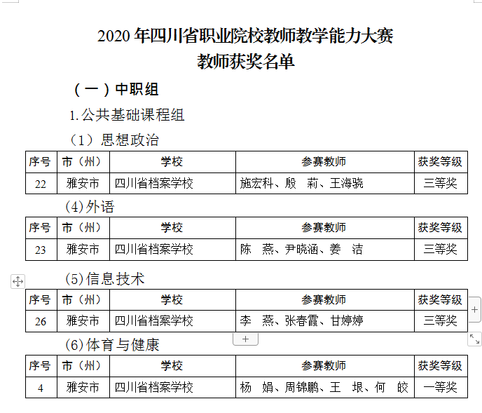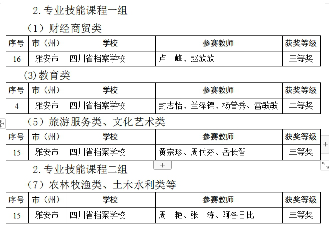金秋十月,由四川省教育厅组织的四川省职业院校教师教学能力大赛结果正式公布,雅安市中职学校(含雅职院中职组)16个参赛团队在本次比赛中获奖,我校8个团队喜获一等奖1个,二等奖1个,三等奖6个的好成绩。档案管理专业团队更是以其独特的办学及专业优势成为雅安市唯一被推荐参加国赛的中职作品之一,将与省内14个团队代表四川参加全国职业院校教师教学能力大赛的角逐。