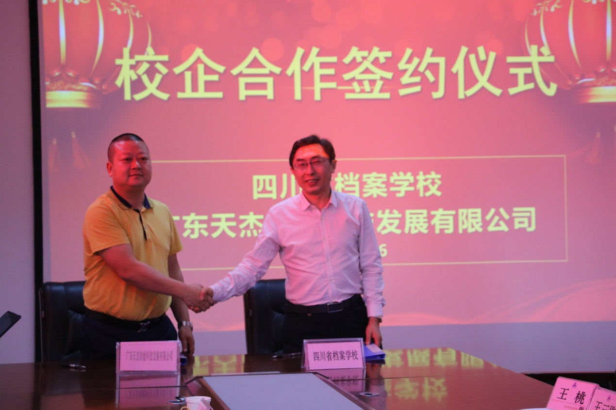 仪式上,王小龙称赞学校作为全国大中专学校中唯一一所档案学校,办学特色鲜明,校园环境古朴典雅,充满书香气息。同时,王小龙介绍了广东天杰智能科技发展有限公司基本情况,表示将和学校在实训设备、师资培养、专业建设、搭建就业平台等方面开展合作,促进校企双元育人,培养适应社会需求的专业人才。