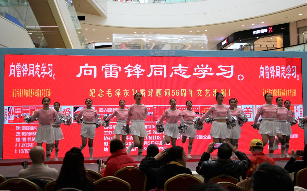 在雅安万达广场、雅安市爱心联盟联合主办的“向雷锋同志学习”纪念毛泽东为雷锋题词56周年文艺汇演活动中,我校学生表演的现代舞《LATATA》和啦啦操《舞动青春》赢得了在场观众们的一致好评。