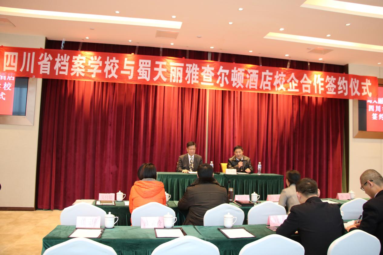学校副校长童以鸿与蜀天丽雅查尔顿酒店总经理邓志华分别代表学校和酒店签署了四川省档案学校高星级饭店运营与管理专业校企合作协议,并进行了“四川省档案学校高星级饭店运营与管理专业实训基地”“蜀天丽雅查尔顿酒店人才培养及项目合作开发基地”牌匾的互授。