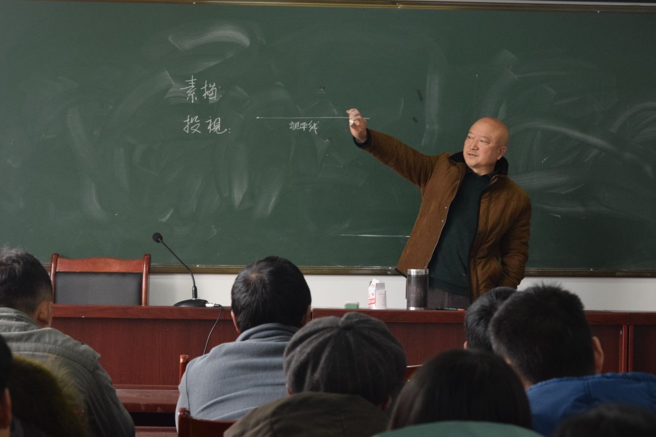 课堂主要以学习素描基础知识为主,刘兴大师从绘画工具开始讲解,画法、阴影和透视是授课的重点,其中透视又作为重中之重来讲授。在讲课过程中,刘大师边讲边在黑板上进行实操演练,直观展示了三种不同透视效果。最后,刘大师希望同学们在课后练习排线,多用几何体模型进行绘画练习,抓好基本功,提高素描能力。