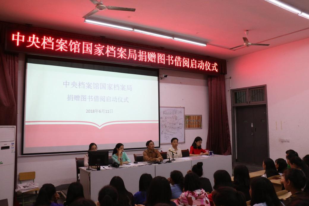 6月11日下午4:30,中央档案馆国家档案局捐赠图书开放借阅启动仪式在四川省档案学校第二教学楼举行,全体喜德籍学生参加。仪式上,校党委书记、校长徐宏感谢了中央档案馆国家档案局对学校和喜德籍学生的关心与支持,并勉励学生们要珍惜把握在校时光,树立终身学习的理念,既要把书读“厚”,也要把书读“薄”,既要深度钻研专业知识,也要广泛涉猎课外知识,努力把自己打造成祖国和社会所需要的“T”字型人才。