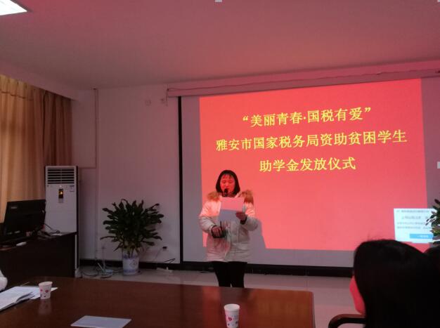 2017年12月25日,“美丽青春・国税有爱”雅安市国家税务局资助我校贫困学生助学金发放仪式在四川省档案学校举行。雅安市国家税务局机关工会主席王广文,副主席曾焰、周锐,四川省档案学校党委副书记李富民等相关人员参加活动。