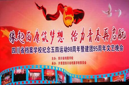 4月27日晚,为纪念“五四”运动98周年暨建团95周年及共青团四川省档案学校委员会成立30周年,弘扬爱国主义精神,“缘起西康筑梦想・给力青春再启航” 五四主题晚会在学校大礼堂隆重举行。共青团雅安市委副书记陆艳,四川省档案局宣教处干部白晨皓,雅安市教育局职成科干部钟洁,校党委书记、校长徐宏,校党委副书记、副校长张其可,副校长童以鸿出席晚会。