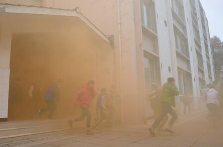 14点30分,随着校园警报声响起,各位班主任立即到达指定岗位,引导楼内学生快速疏散,带领学生弯着腰、用手帕、毛巾等捂住口鼻,沿着指定路线快速前进,有序从宿舍撤离到学校操场的安全地带。随即,各班班长清点人数,并向保卫科汇报疏散情况,整个撤离用时3分38秒,2500多名师生全部安全疏散完毕。