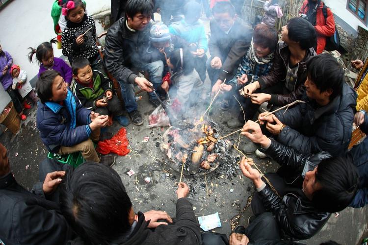第一天“库斯”,这天天还未亮各家各户就起来,男的在家清扫祖宗灵位,洗涮敬奉祖灵的餐具,磨刀,宰杀过年猪,妇女们做荞饼。荞饼和鸡肉煮熟后,用木碗装好鸡头和两块腿肉、三个荞饼再敬祖灵。
