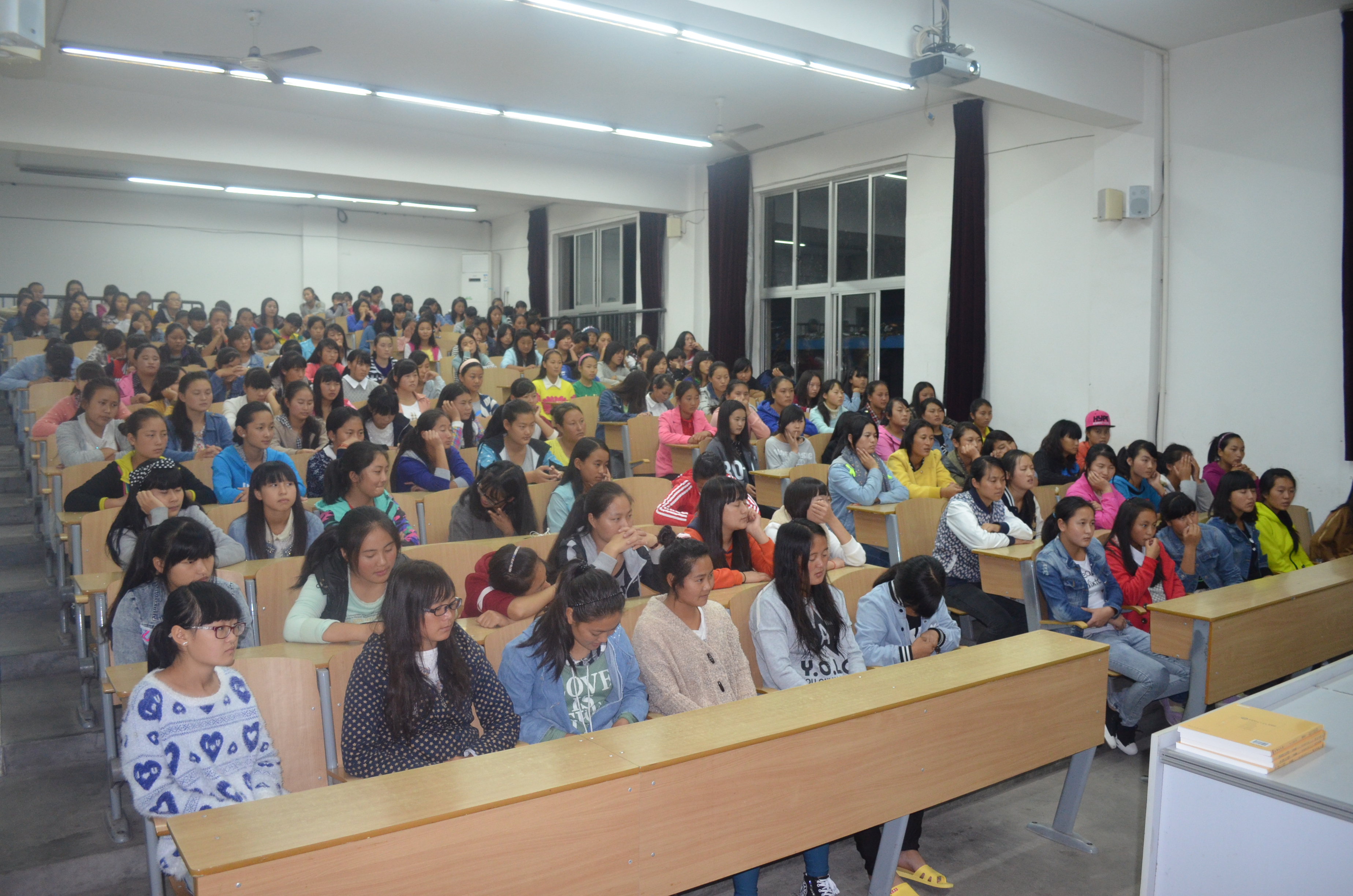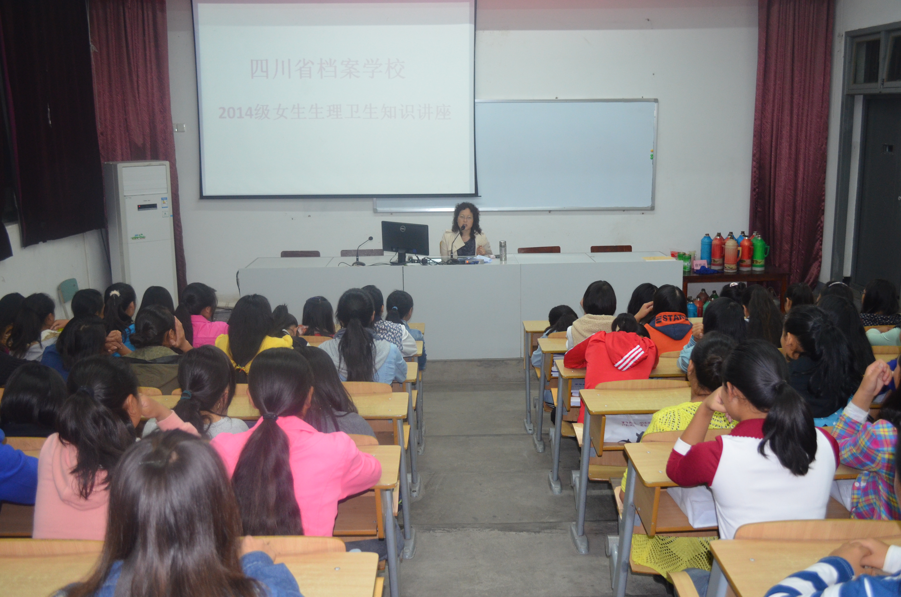 二教学楼阶梯教室举行了2014级女生生理卫生知识讲座。讲座由学校校医周定淑老师主讲,2014级全体女生参加。