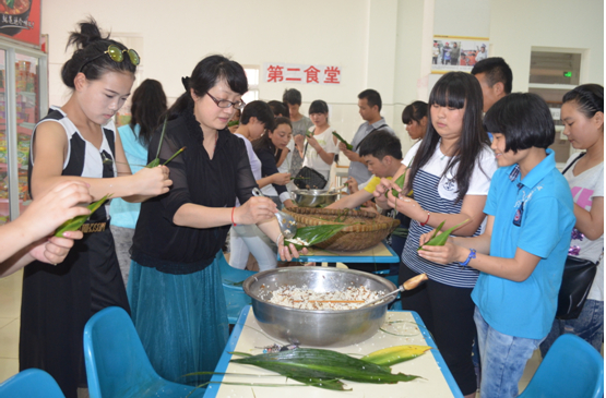 15:00,活动正式开始。学生科王三刚老师首先向留校学生介绍了端午节的由来和各地的风俗习惯,接下来老师和学生们一起动手包粽子。在一片祥和的节日氛围中,老师同学生们一起相互帮忙,互相协作,折粽叶、填糯米、裹叶子、扎线……一道道工序有条不紊地进行着,忙得不亦乐乎。在包粽子的过程中,大家不停地互相交流经验。学生们看着自己包出来的形态各异的粽子,都忍不住哈哈大笑,整个食堂充满了欢乐的气氛。一只只小粽子,传递了大家的欢乐,洋溢着节日的气氛和欢快的笑声。