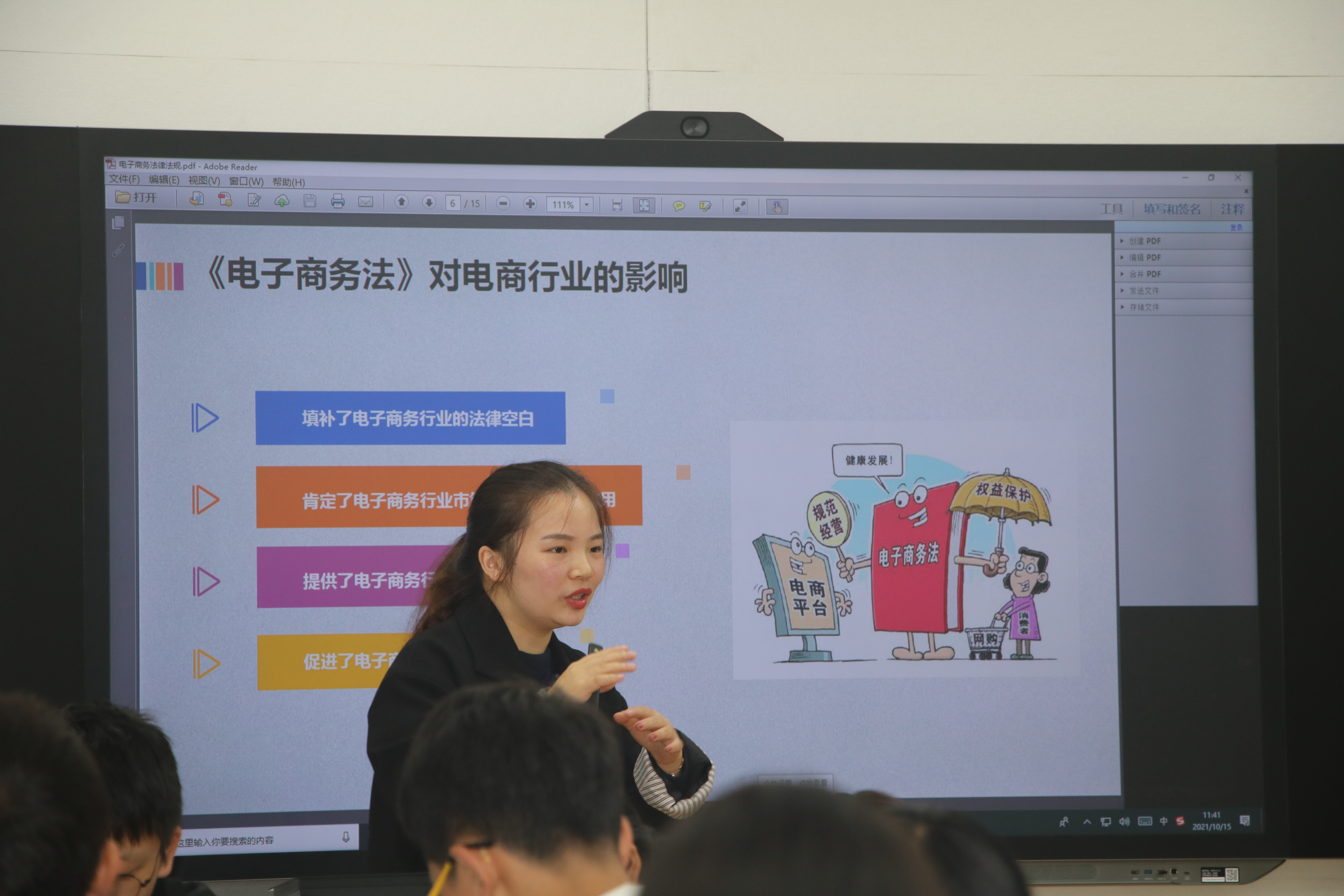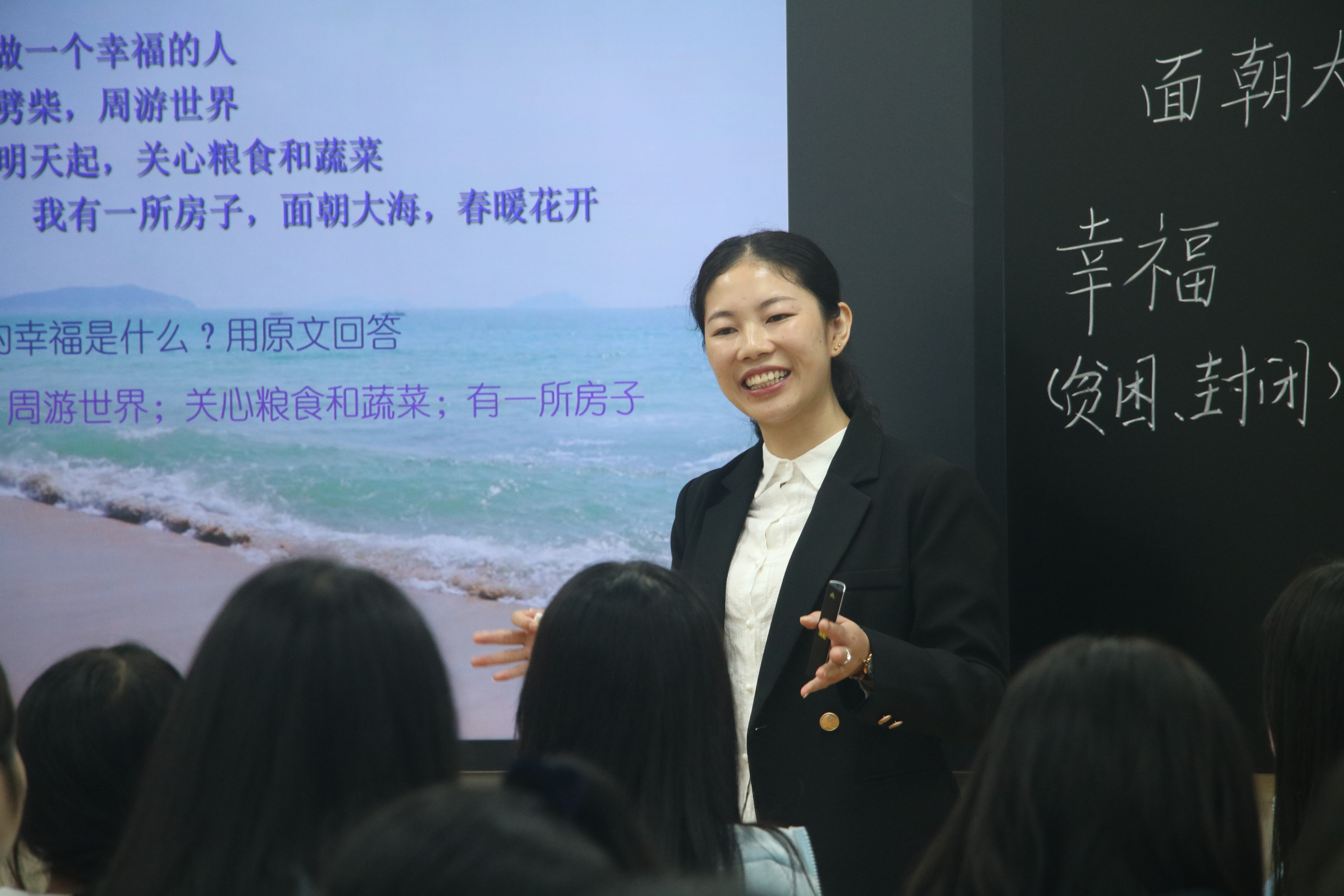 语文教研组组长郭冬梅老师和电子商务教研组组长赵放放老师分别带来了一堂课程思政展示课。郭老师教态大方,思路清晰,引导学生学会以积极乐观的态度对待生活中的挫折,建立合乎主流价值观的幸福观。赵老师注重联系实际,巧用案例,引思明意,学会用法律武器维护自身合法权益。全校教师通过直播或现场听课的方式进行了观摩学习。