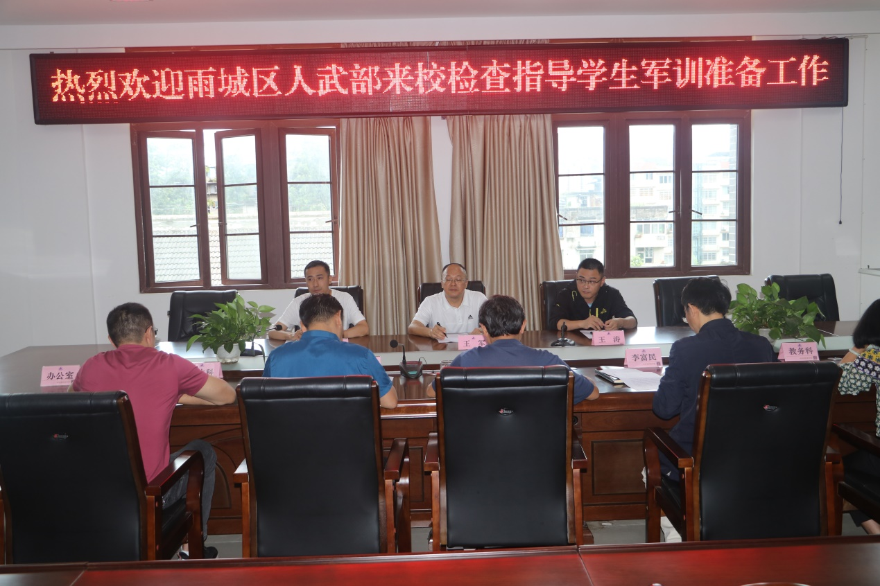 8月26日下午,雅安市雨城区人武部部长王军、副部长王涛、军训科科长姜驰一行来我校检查指导学生军训准备工作。