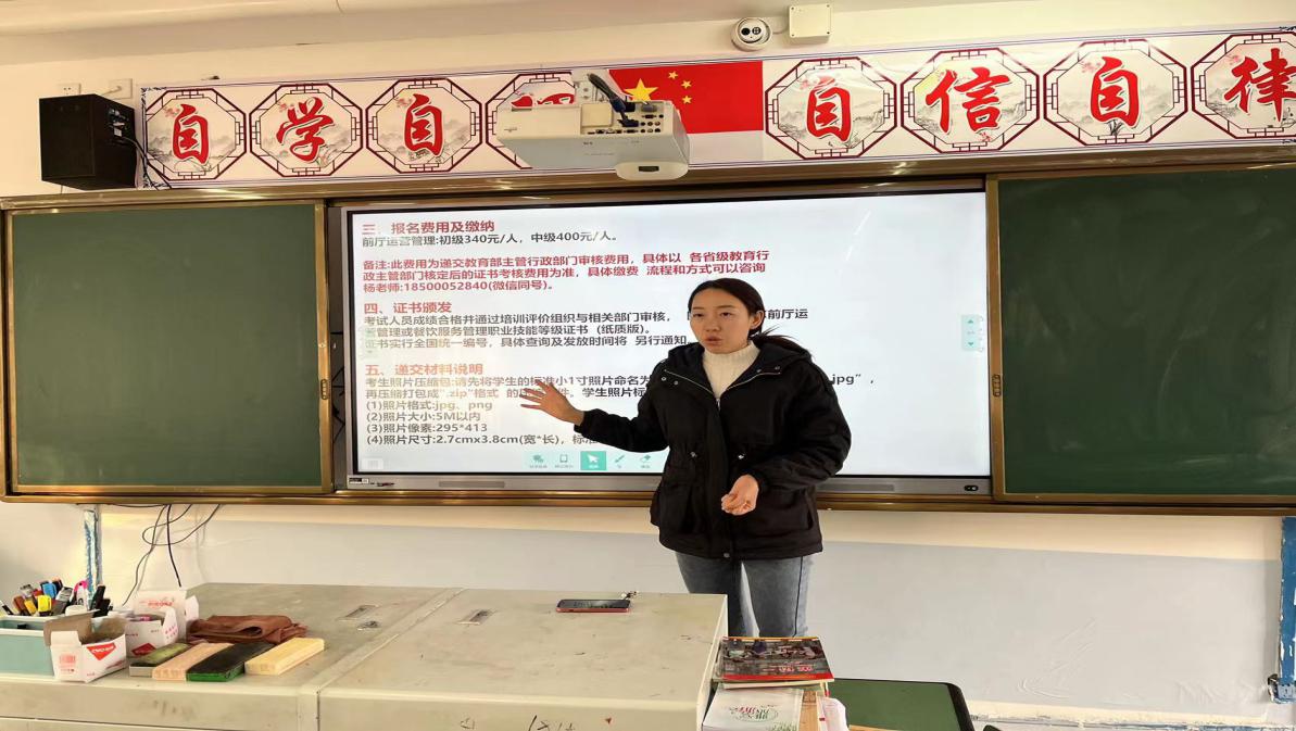 为贯彻落实《国家职业教育改革实施方案》,积极推进“学历证书+若干职业技能等级证书”制度试点工作,11月22日,我校高星级饭店运营与管理专业教研组在实训楼501教室召开“1+X”前厅运营管理职业技能等级证书考前动员大会。全体专任教师和学生参加本次考前动员大会。