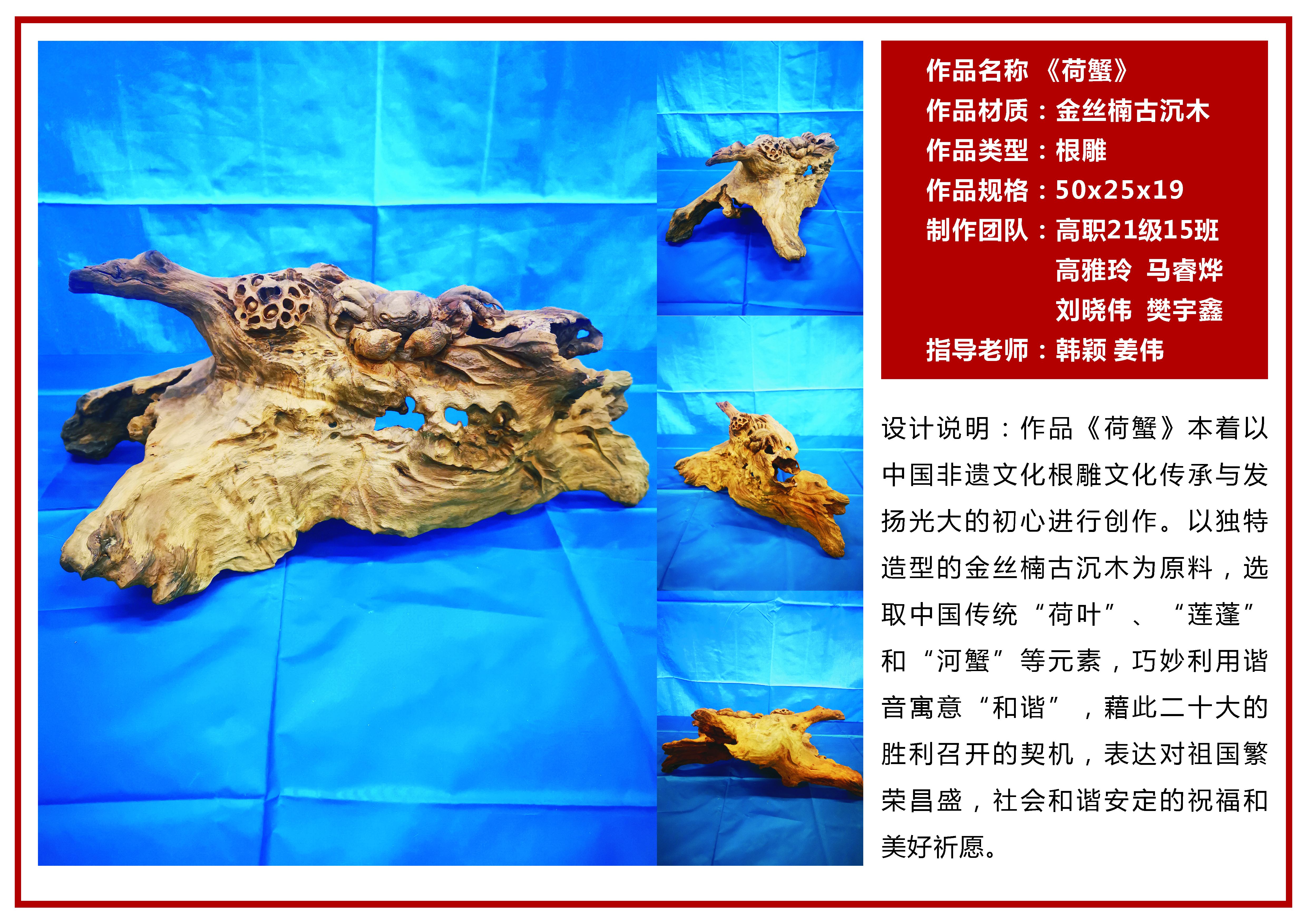 作品《荷蟹》本着以中国非遗文化根雕文化传承与发扬光大的初心进行创作。以独特造型的金丝楠古沉木为原料,选取中国传统“荷叶”、“莲蓬”和“河蟹”等元素,巧妙利用谐音寓意“和谐”,藉此二十大的胜利召开的契机,表达对祖国繁荣昌盛,社会和谐安定的祝福和美好祈愿。