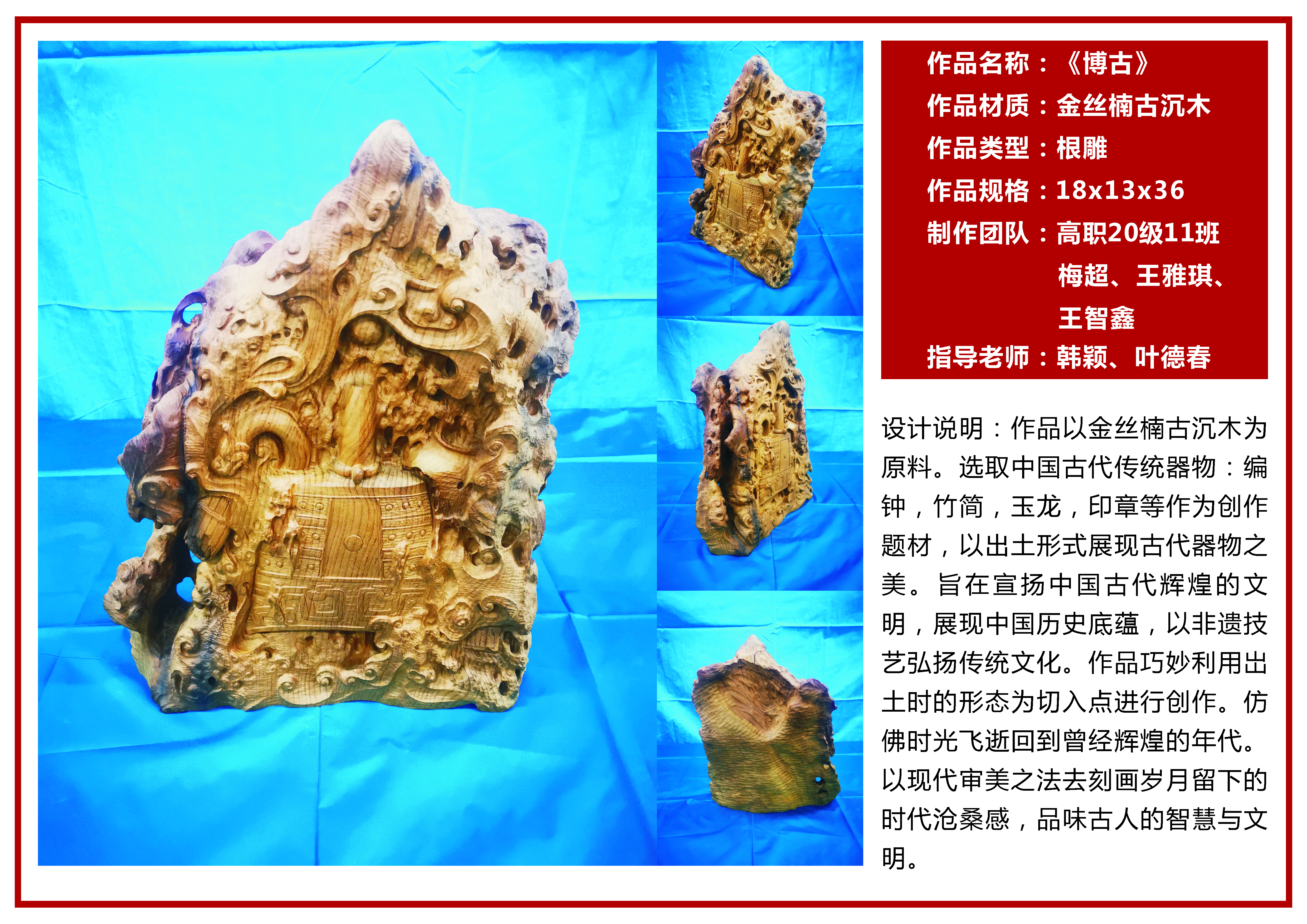 作品《博古》作品以金丝楠古沉木为原料。选取中国古代传统器物:编钟,竹简,玉龙,印章等作为创作题材,以出土形式展现古代器物之美。旨在宣扬中国古代辉煌的文明,展现中国历史底蕴,以非遗技艺弘扬传统文化。作品巧妙利用岀土时的形态为切入点进行创作。仿佛时光飞逝回到曾经辉煌的年代。以现代审美之法去刻画岁月留下的时代沧桑感,品味古人的智慧与文明。