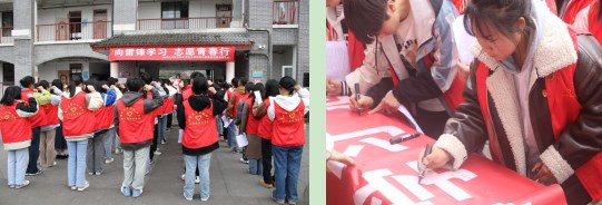 启动仪式上,青年志愿者代表高职22级6班周璐瑶同学带领大家共同学习雷锋事迹,并向大家发出“向雷锋学习 在实践中践行志愿精神”的倡议;在青年志愿者代表高职22级4班何瑶同学的带领下,全场50余名志愿者进行志愿宣誓,决心向雷锋同志学习,大力弘扬和传承雷锋精神,做一颗永不生锈的螺丝钉!宣誓完毕,全体志愿者在学雷锋宣传横幅上郑重地签下了自己的名字。