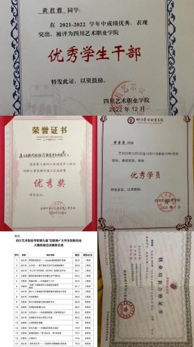 在校几年的时间,她的努力也得到了回报,进入大学后通过竞选成功被评选为本专业团支部书记,在此期间不断参加各种活动以及志愿服务来提升自我。并且在不断的学习以及平时工作成果的展现中,被学院评为优秀学生干部。2023年通过和同学的合作互助在学校举办的“互联网+大学生创新创业大赛”荣获优秀奖。同年与设计系的同学参加四川省第三届退伍军人创新创业大赛荣获优秀奖。在大赛里她学习观摩到了更优秀的团队以及一些自身不具备的条件,这更坚定了她还需要不断的努力学习继续深造。今年黄君蓉也成功荣获国家励志奖学金,这无疑是她人生路上又一份被肯定的声音。