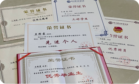 在就读四川艺术职业学院期间,曾多次荣获“优秀志愿者”“优秀团员”“三好学生”“优秀毕业生”等荣誉称号。2023年,通过不懈的努力终于如愿以偿,顺利通过专升本考试,考入四川音乐学院文化产业管理专业就读,并荣获四川音乐学院“先进个人”称号。