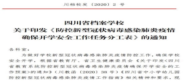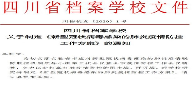 新冠肺炎疫情发生以来,四川省档案学校高度重视,坚持把师生生命安全和身体健康放在第一位,坚决贯彻习近平总书记对疫情防控工作的重要讲话和指示精神,扎实落实党中央、省、市关于新冠肺炎疫情防控决策部署,把新冠肺炎疫情防控工作作为当前学校最重要的工作来抓,真抓实干,落细落实,全力防控,坚决打赢疫情防控阻击战。