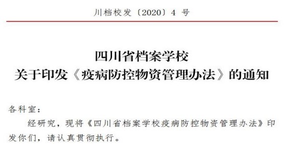 提前谋划,保障防疫有序推进。按照省教育厅《四川省教育系统防控新型冠状病毒感染肺炎疫情确保开学安全的工作预案》的要求,为妥善做好疫情防控时期各项开学准备工作,学校制定了《2020年春季学期开学准备工作方案》,坚决防止疫情向校园蔓延,确保师生生命安全。2月10日学校召开校长办公会,专题研究学校疫情防控物资管理办法,切实做好后勤保障和校园防疫工作。为进一步加强学校疫情防控物资的管理,确保物资正常供给和防疫工作有序开展,学校制定并印发了《疫情防控物资管理办法》。